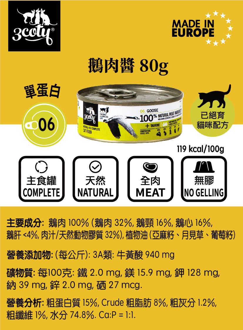 📌 Due to its 100% meat composition and balanced ingredients, 3coty® food can be given to cats with digestive hypersensitivity, food allergies and diabetes, and as a substitute for the B.A.R.F.
