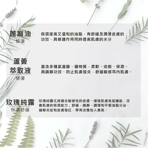 ‧ 蘆薈和玫瑰純露低敏保濕,讓定期的保養步驟轉化為大自然的香氛享受